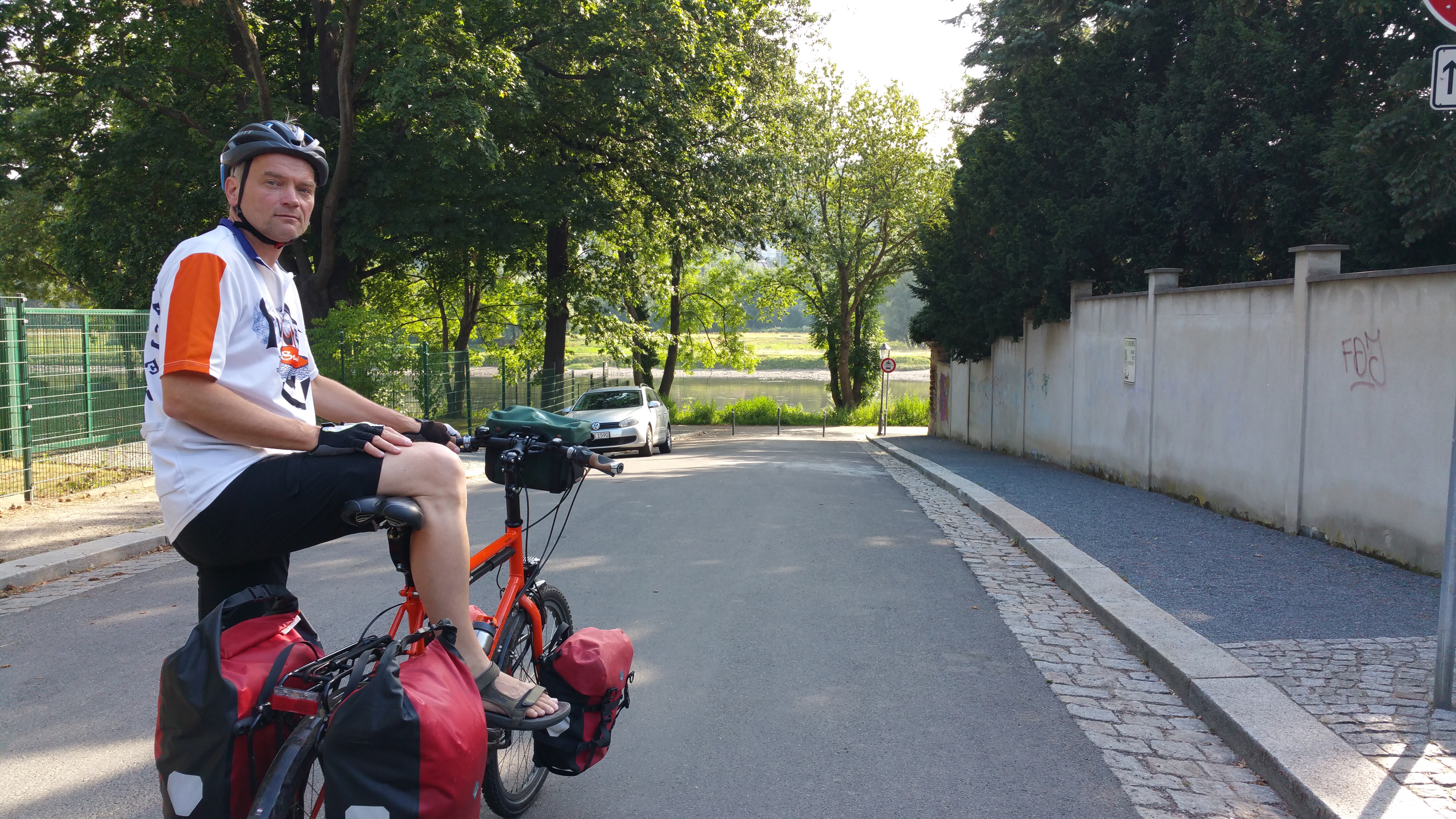 Statt im Hotel frühstücken wir lieber an der Elbe und wir freuen uns, als wir die Elbe zum ersten Mal zu sehen bekommen.
