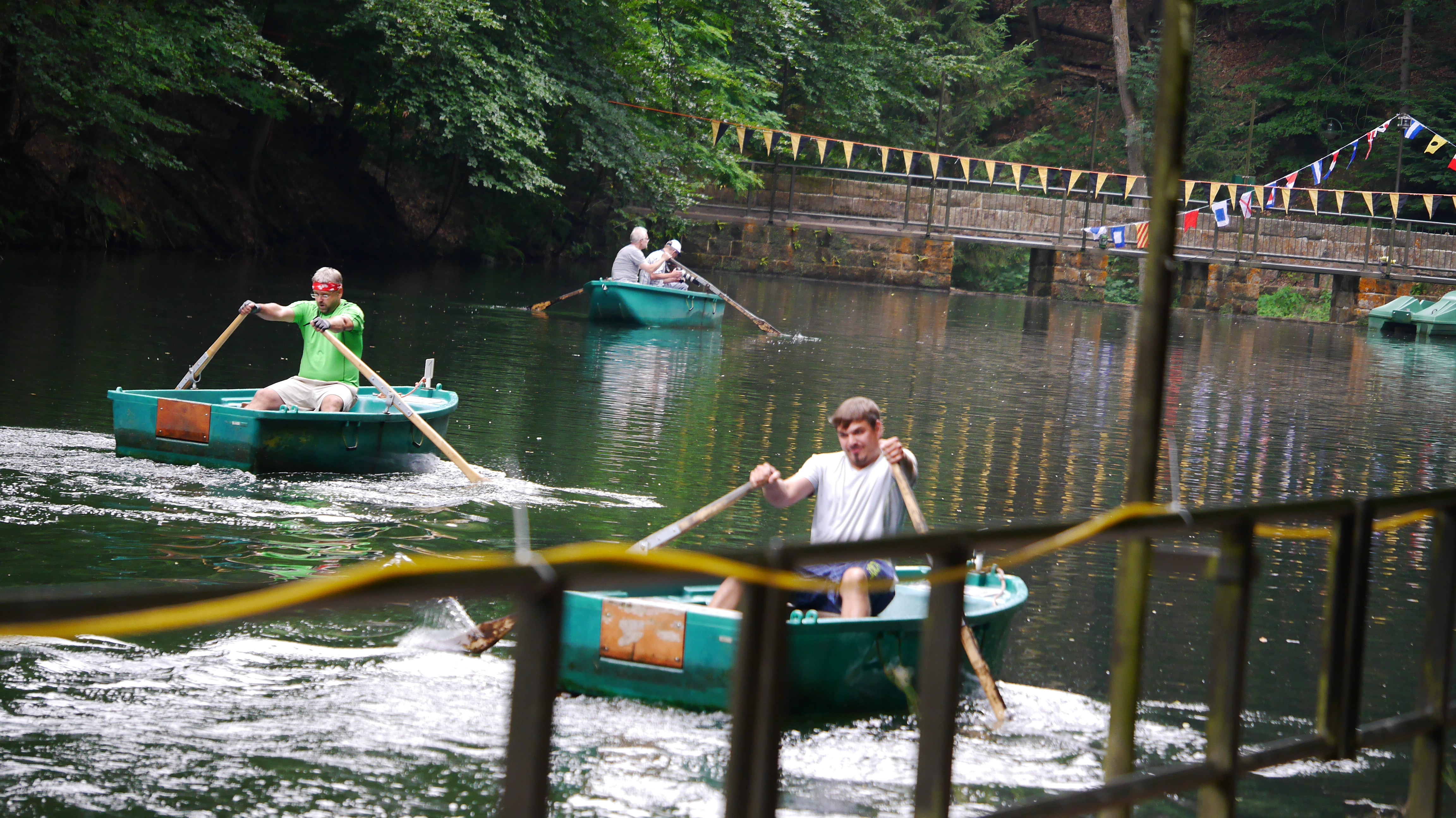Unten angekommen kommen wir an einem Stausee vorbei, wo gerade die lokale Meisterschaften in Zweikampfs Bootsrudern abgehalten werden. So wahnsinnig spannend empfinden wir eigentlich nicht, das Rennen das wir angucken, aber der Kommentator ist sehr begeistert dabei 😉