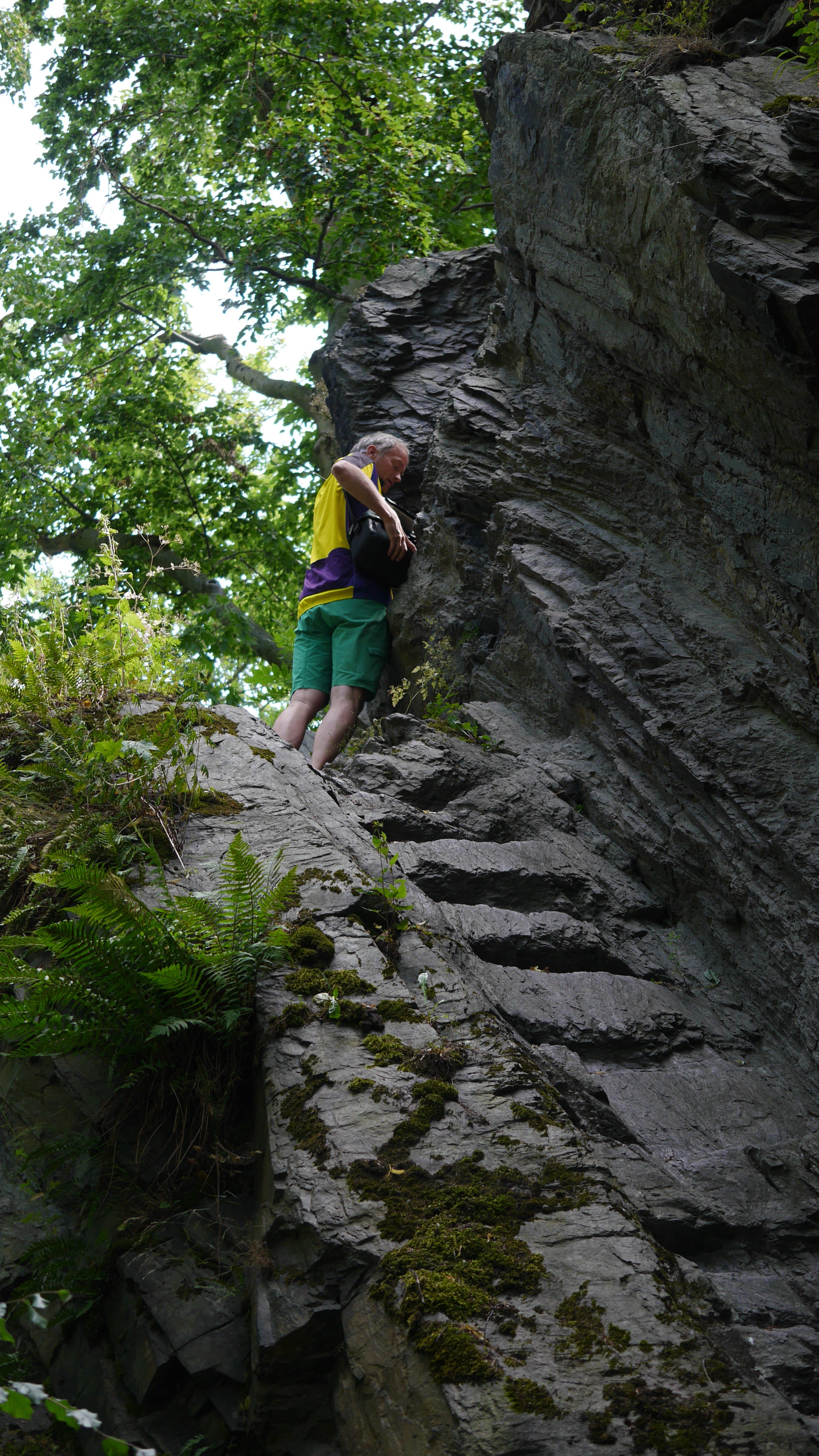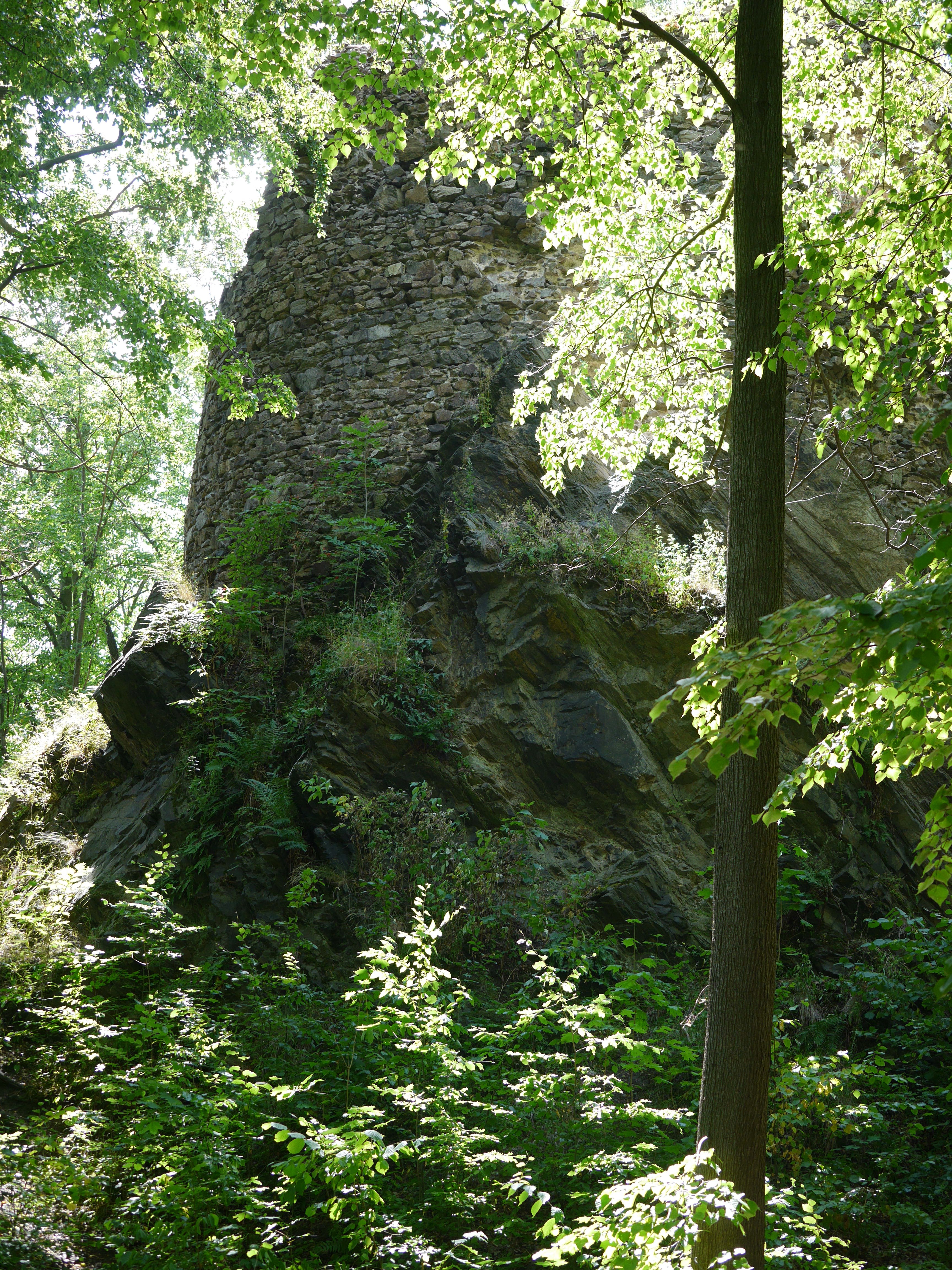 Kurz darauf kamen wir bei der Ruine von Wachburg Hamrstejn vorbei. Die Ruine ist fast zugewachsen und spärlich ausgeschildert, aber beim zweiten Anlauf haben wir sie gefunden. Der eine Turm hat eine in den Felsen gemeisselte Treppe, die wir gemeistert haben; nur das letzte Stück Felsen in den Turm hinein haben wir uns nicht getraut zu erklettern.