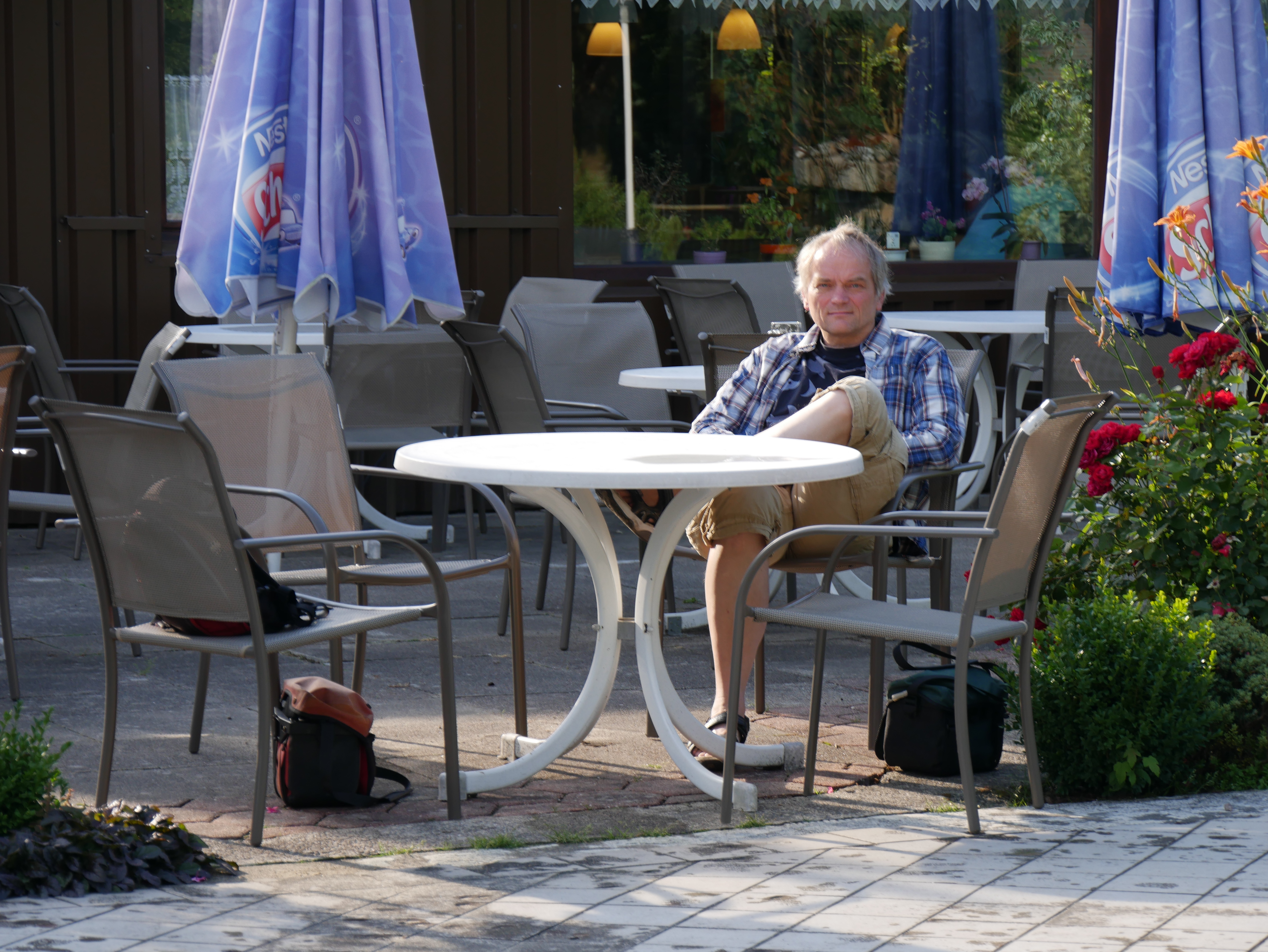 Nach den letzten Vorbereitungen sind wir um 10.20 in Kiel losgefahren … ohne Frühstück. Das habe wir bei bei Fiedler im Russeer Weg nachgeholt. Es zogen sich die Wolken zusammen, so dass wir es uns draußen unter einem Dach gemütlich machten. Eine gute Idee… der Wolkenbruch ließ nicht lange auf sich warten. Vorbeifahrende Autos spritzten das Wasser sehr hoch in die Luft. Nicht mal einen km fuhren wir anschließend über die Autobahnbrücke zum Bahnhof Russee, bis Rendsburg dann mit dem Zug.